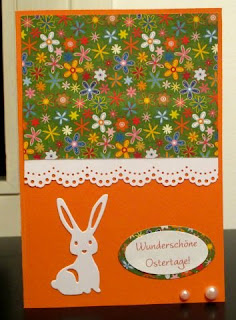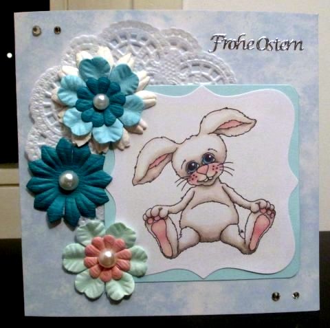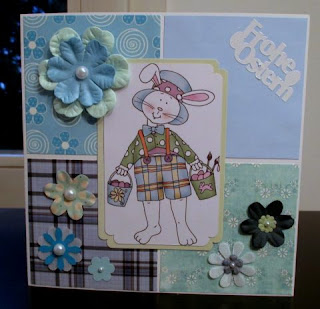 Obwohl es heute wieder richtig kalt geworden ist, habe ich eine Osterkarte gebastelt. Der kleine "Hasenmaler" ist ein Digi von freedeariedolls. Mit dem Bemalen der Ostereier scheint er schon fertig zu sein ;)