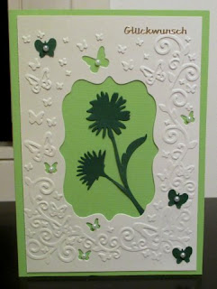 Heute habe ich meine Schablone Schmetterlingsrahmen gleich noch einmal verwendet. Diesmal habe ich in den Rahmen eine ausgestanzte Blume geklebt und noch ein paar Schmetterlinge in der gleichen Farbe hinzugefügt...