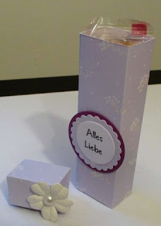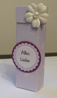 Die liebe Sigrid hat uns eine Goodie Box vorgestellt. Wie diese Box zu basteln ist, könnt ihr in ihrem Video nachsehen. Ich habe die "faule Variante" gewählt und gleich das Designerpapier verwendet, um mir die Kleberei der kleinen Teile zu sparen. Auch das Bändchen habe ich weggelassen, dafür aber ein Blümchen aufgeklebt.