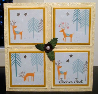 Quad - so könnte man diese Karte nennen, die aus vier mal drei gleich großen Bildern bzw. Quadraten besteht. Der Hintergrund ist Tapete. Das Papier mit dem Hirsch findet ihr übrigens beim papercraftermagazine.